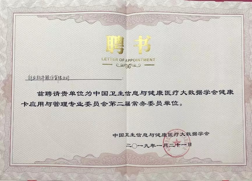 經(jīng)選舉產(chǎn)生新一屆專委會委員、常務(wù)委員、主任委員、副主任委員、秘書長,創(chuàng)業(yè)軟件受聘成為中國衛(wèi)生信息與健康醫(yī)療大數(shù)據(jù)學會健康卡應(yīng)用與管理專業(yè)委員會第二屆常務(wù)委員單位。