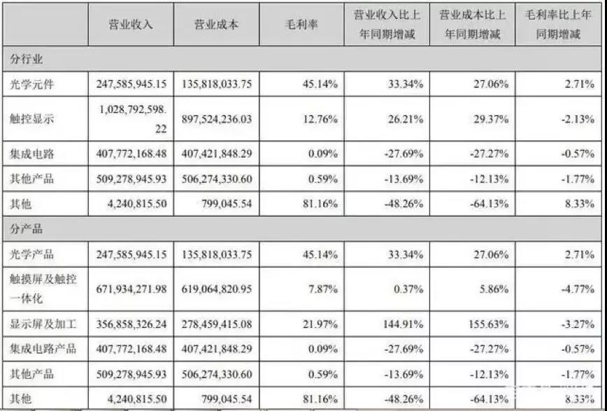 雖然觸控顯示類業務是聯創電子最大的主營業務,但今年上半年,該公司的光學產品成為光學產品、顯示屏及加工、集成電路產品、其他產品幾大主營分產品中毛利率唯一增加的一個主營產品。